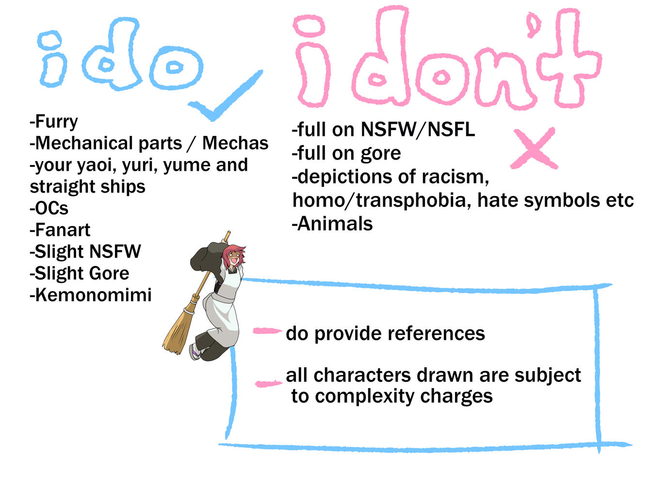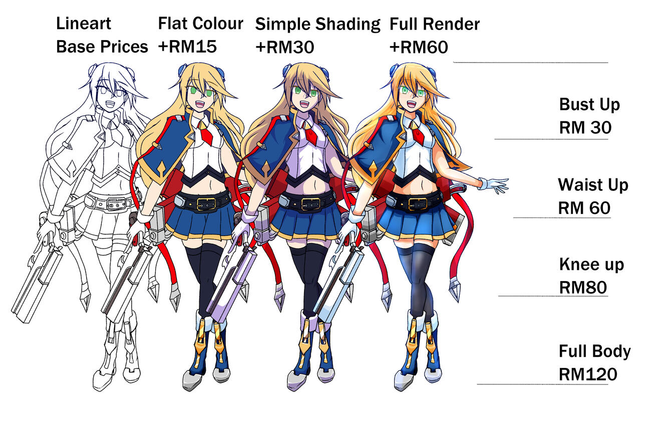 Prices are for 1 character onlyFlat Colour, Simple Shading and Rendering will have additional charges (displayed below)Additional Characters will be charged double the priceCharacters come with a simple background, Complex backgrounds are subject to additional charges